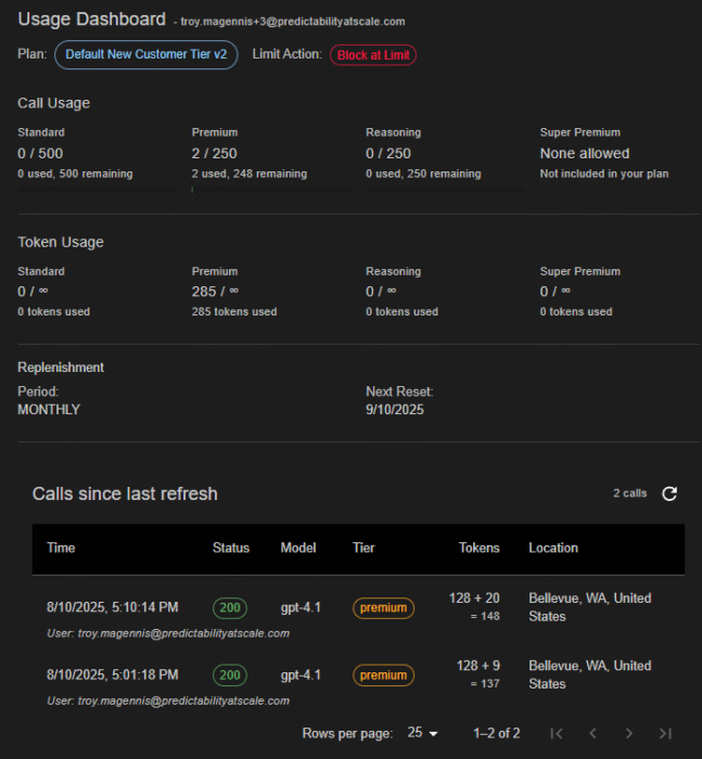 There is a new tab in the Customers view when you select a customer. USAGE & LIMITS. It has all of the current tier, call use details, and replenishment options. If you want to move a customer to a new tier, click on the CHANGE TIER button.